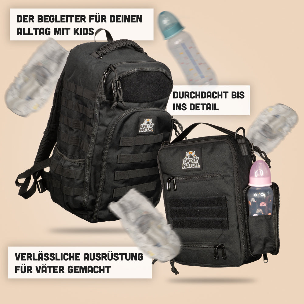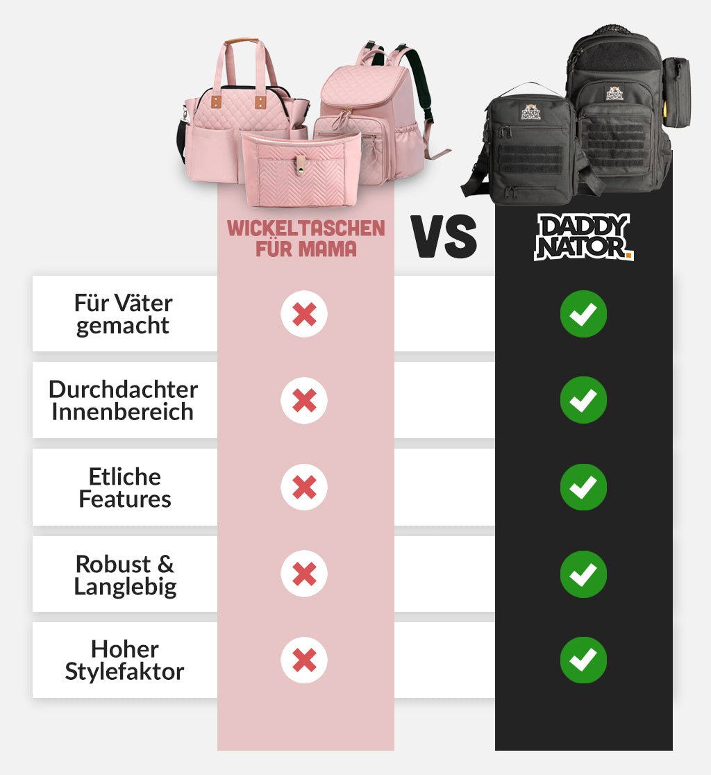 Warum eigentlich nicht? Wir von Daddynator haben einen Wickelrucksack speziell für Väter entwickelt, die keinen Bock haben, mit dem rosa Wickeltäschchen von Mama auf Tour zu gehen.