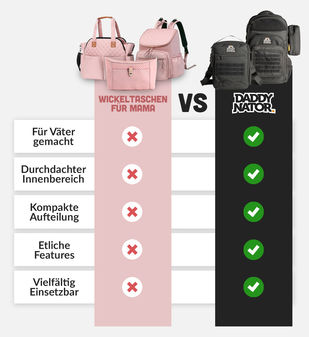 Die Daddynator-Produkte wurden von Vätern für Väter entwickelt, mit markantem Design, das sich klar von Standard‑Wickelrucksäcken und Taschen abhebt. Innen ist alles logisch sortiert, robust verarbeitet und schnell griffbereit – weniger Kramen, mehr Kümmern!